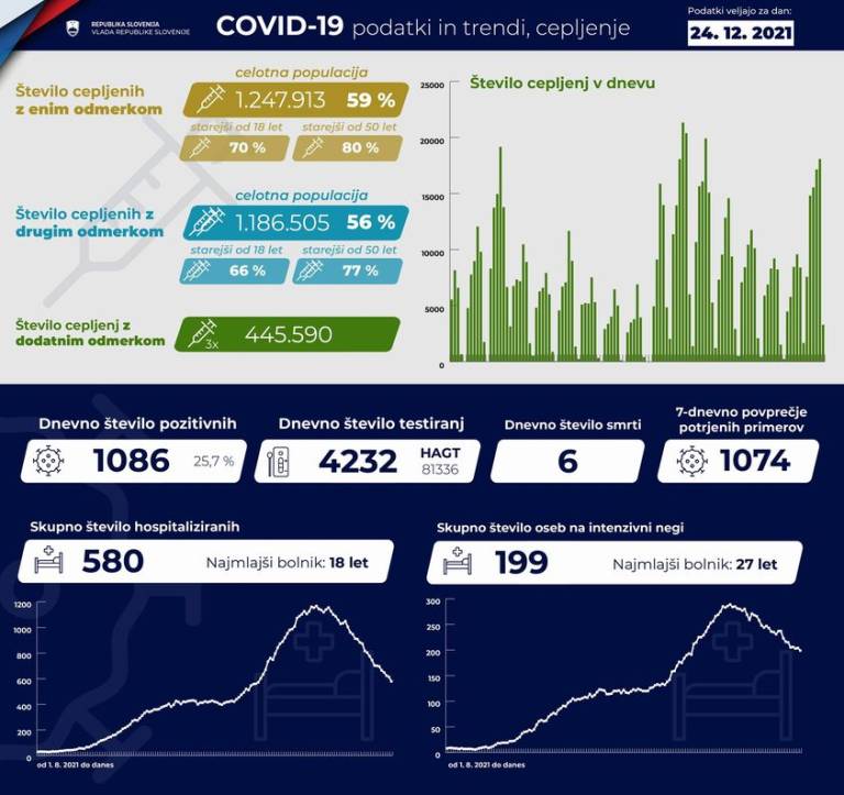 V Sloveniji so včeraj, 24. decembra, opravili 4232 PCR testiranj na koronavirus in potrdili 1086 novih okužb, gre za 25,7-odstotni delež okužb.