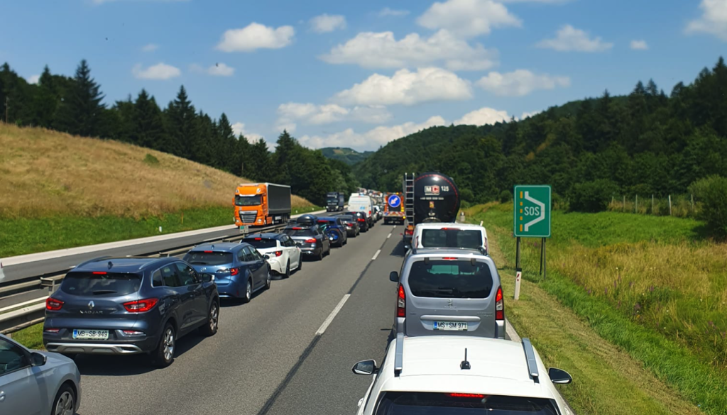 Na štajerski avtocesti je pred mejnim prehodom Šentilj proti Avstriji kilometer dolga kolona vozil. Dodatno je zaradi prometne nesreče promet oviran na podravski avtocesti med razcepom Draženci in Hajdino v smeri proti Mariboru.