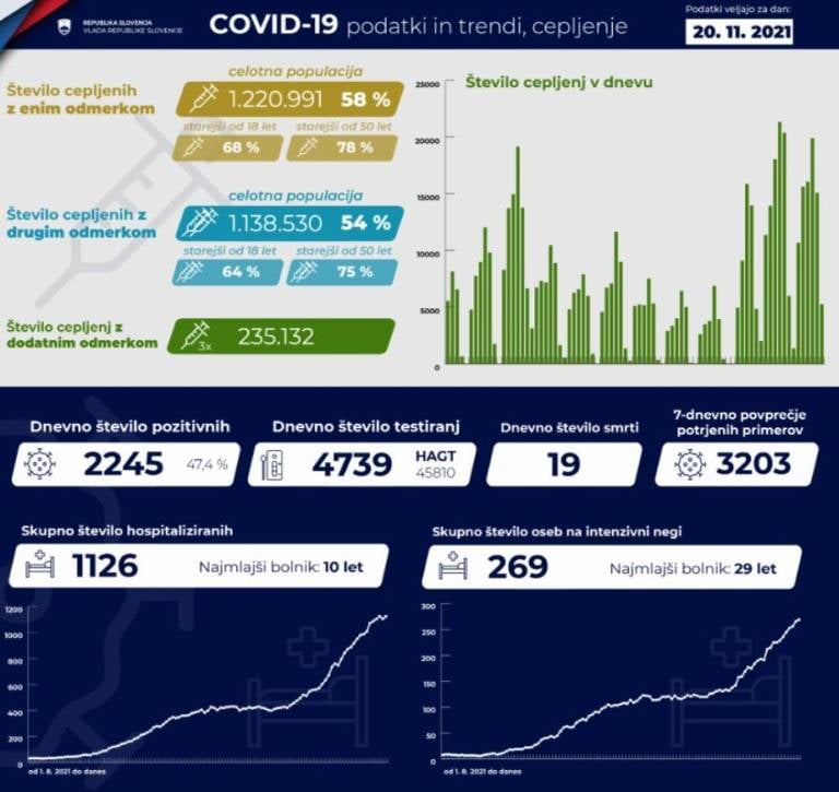 Trenutno je po podatkih Covid-19 Sledilnika v bolnišnicah hospitaliziranih 1126 covidnih bolnikov, od tega je 269 pacientov na intenzivni negi.