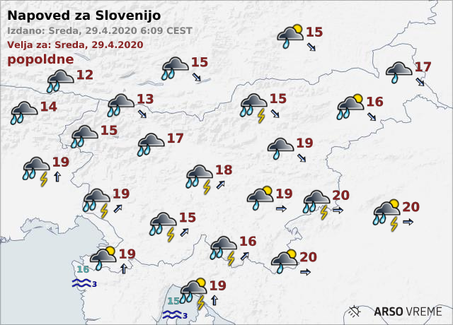 Po napovedih Agencije Republike Slovenije za okolje bo danes pretežno oblačno: »Padavine se bodo postopno razširile na vso Slovenijo, vmes bo tudi kakšna nevihta. Najvišje dnevne temperature bodo od 15 do 20 stopinj Celzija.«