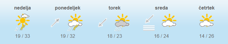 Jutri bo še večinoma sončno, pihal bo južni do jugozahodni veter. Proti večeru se bodo od severa začele pojavljati plohe in nevihte. Najnižje jutranje temperature bodo od 15 do 21, najvišje dnevne od 27 do 34 stopinj Celzija.