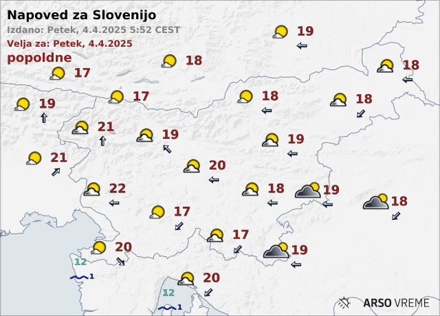 Jutri bo prevladovalo sončno vreme, proti večeru pa se bo oblačnost od severa povečala. Jutranje temperature bodo od 2 do 5, v alpskih dolinah in na planotah Notranjske okoli 0, najvišje dnevne od 19 do 23 stopinj Celzija.