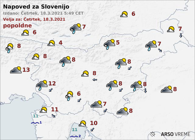 Danes bo spremenljivo oblačno. Predvsem sredi dneva in popoldne bodo krajevne plohe. Ponekod bo pihal severni do vzhodni veter. Najvišje dnevne temperature bodo od 4 do 8, na Primorskem do 12 stopinj Celzija.