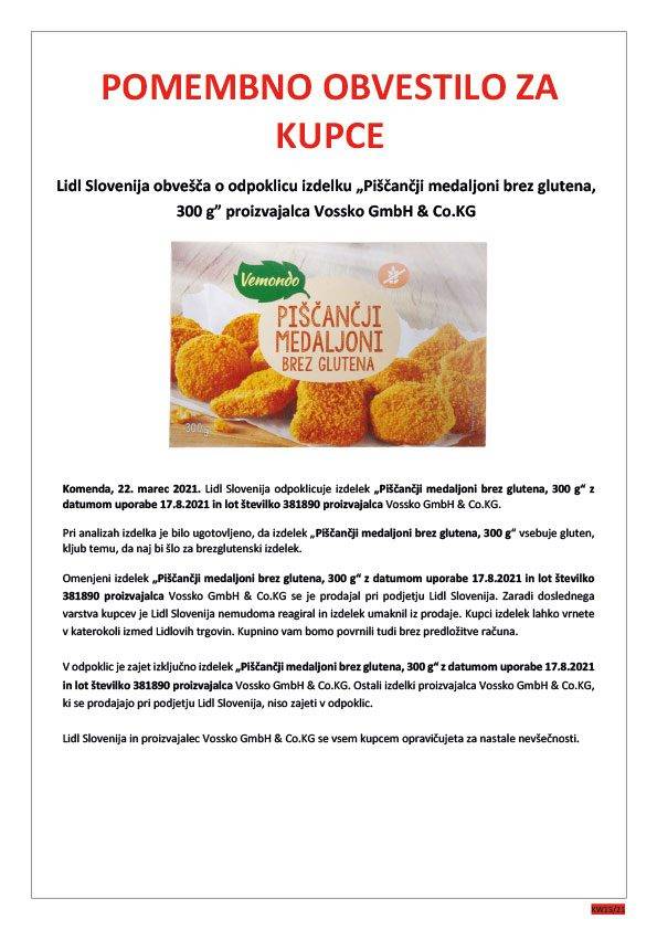 Lidl Slovenija je iz prodaje odpoklical izdelek »Piščančji medaljoni brez glutena, 300 gramov« z datumom uporabe 17. 8. 2021 in lot številko 381890 proizvajalca Vossko GmbH & Co.KG.