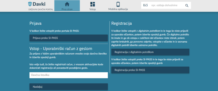 Če digitalnega potrdila nimate, lahko v spletni portal vstopite tudi vpisom davčne številke, nato pa kliknete gumb 'Nadaljuj' in vpišete še zahtevane osebne podatke.