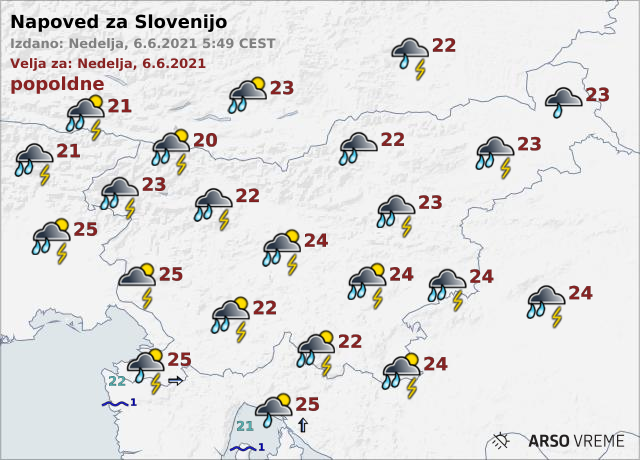 Danes bo spremenljivo do pretežno oblačno. Občasno bodo krajevne padavine, predvsem plohe in nevihte, ki bodo pogostejše popoldne in zvečer, možni bodo krajevno močnejši nalivi.