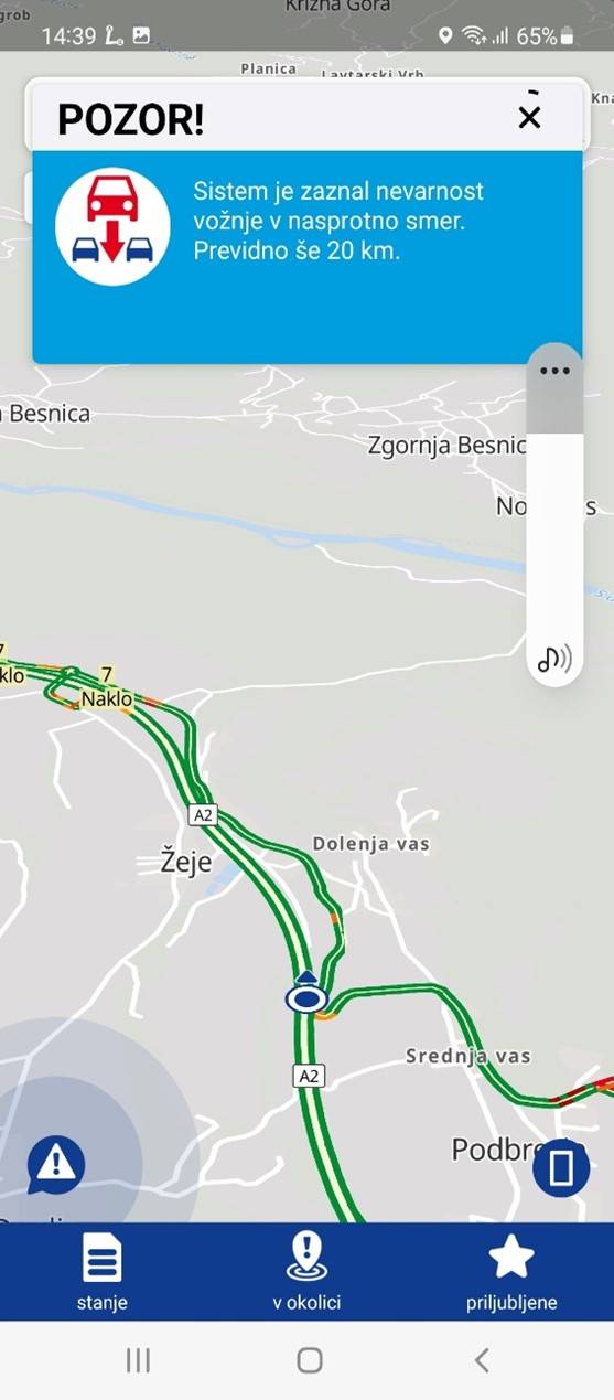 Aplikacija po novem voznike opozarja na nevarnost vožnje v nasprotno smer na slovenskih avtocestah, ki so jo zaznale naprave oziroma sistem senzorjev Družbe za avtoceste v Republiki Sloveniji. Obvestilo je lahko tudi zvočno, prebere ga elektronski bralec.