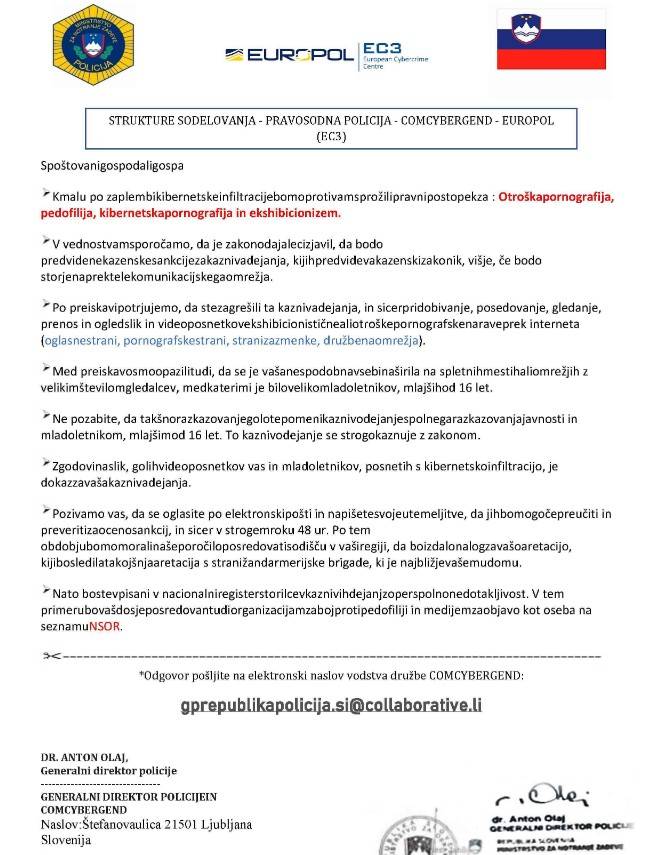 Slovenska policija in Varno na internetu obveščata, da ponovno opažajo nov val lažnega elektronskega sporočila, ki prejemnika obtožuje raznih kršitev v povezavi z otroško pornografijo.