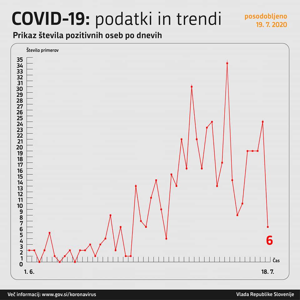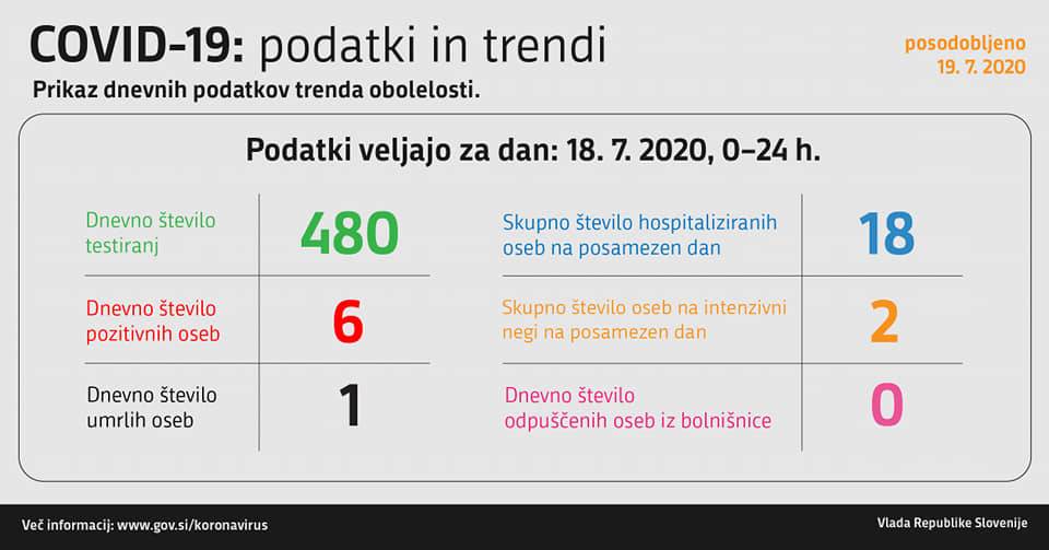 V Sloveniji so včeraj opravili 480 testiranj na novi koronavirus, pri čemer so odkrili šest novih okužb. Skupno število okužb v Sloveniji doslej znaša 1946.