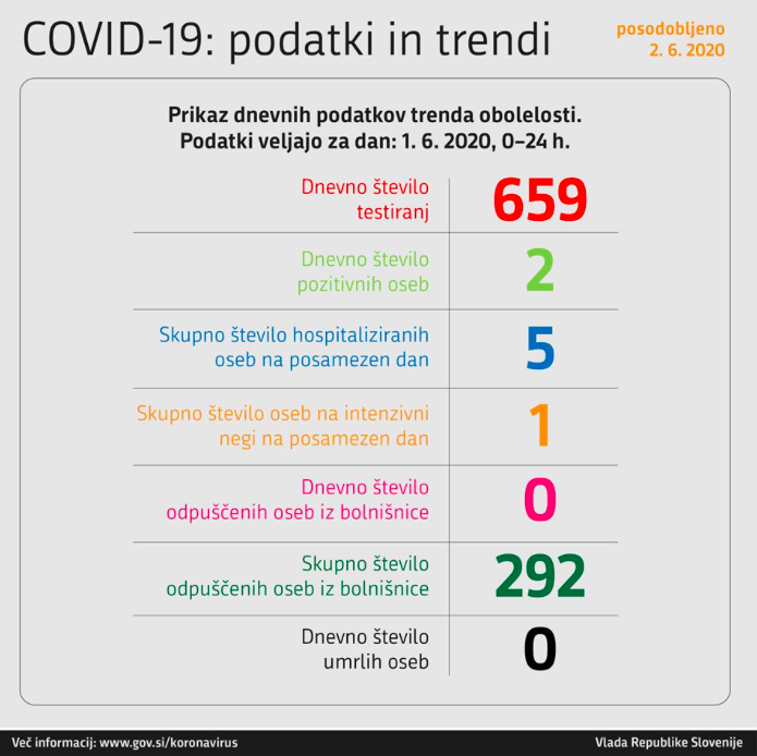 Po zadnjih podatkih, ki jih je sporočila vlada, je bilo včeraj v štirindvajsetih urah opravljenih 659 testiranj, od tega sta bili dve osebi okuženi s koronavirusom.