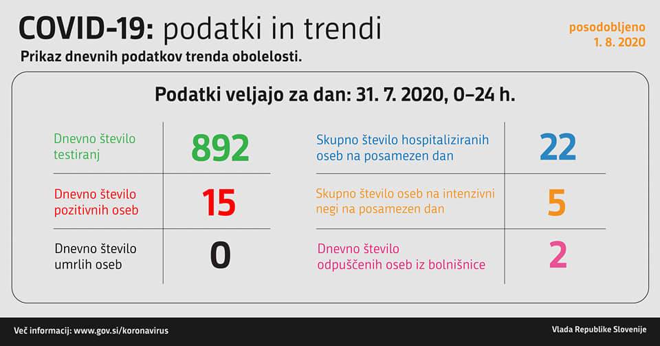 V Sloveniji so včeraj opravili 892 testiranj na novi koronavirus, pri čemer so odkrili 15 novih okužb. Skupno število okužb v Sloveniji doslej znaša 2171.