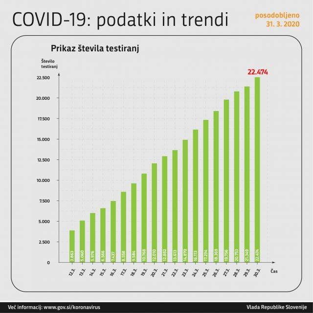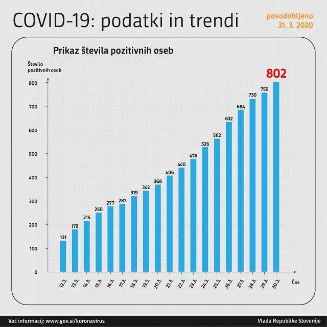 Do danes so testirali 22.477 oseb, samo včeraj 1125. Od tega je 46 novih okužb, kar pomeni, da je v Sloveniji do današnjega dne že 802 okužb s koronavirusom. Iz bolnišnic je bilo odpuščenih šest ljudi.
