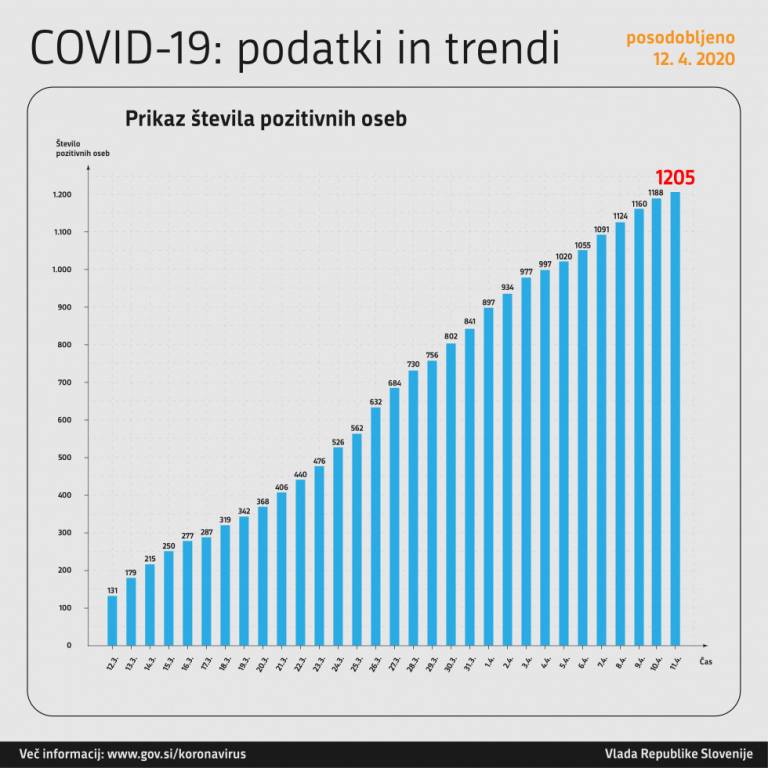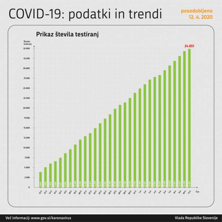 Po podatkih vladne spletne strani za spremljanje epidemije covid-19 je bilo 11. aprila do polnoči testiranih dodatih 572 ljudi, od tega jih je bilo 17 pozitivnih na koronavirus. Vseh testov so doslej opravili 34.851, so sporočili iz urada vlade za komuniciranje.