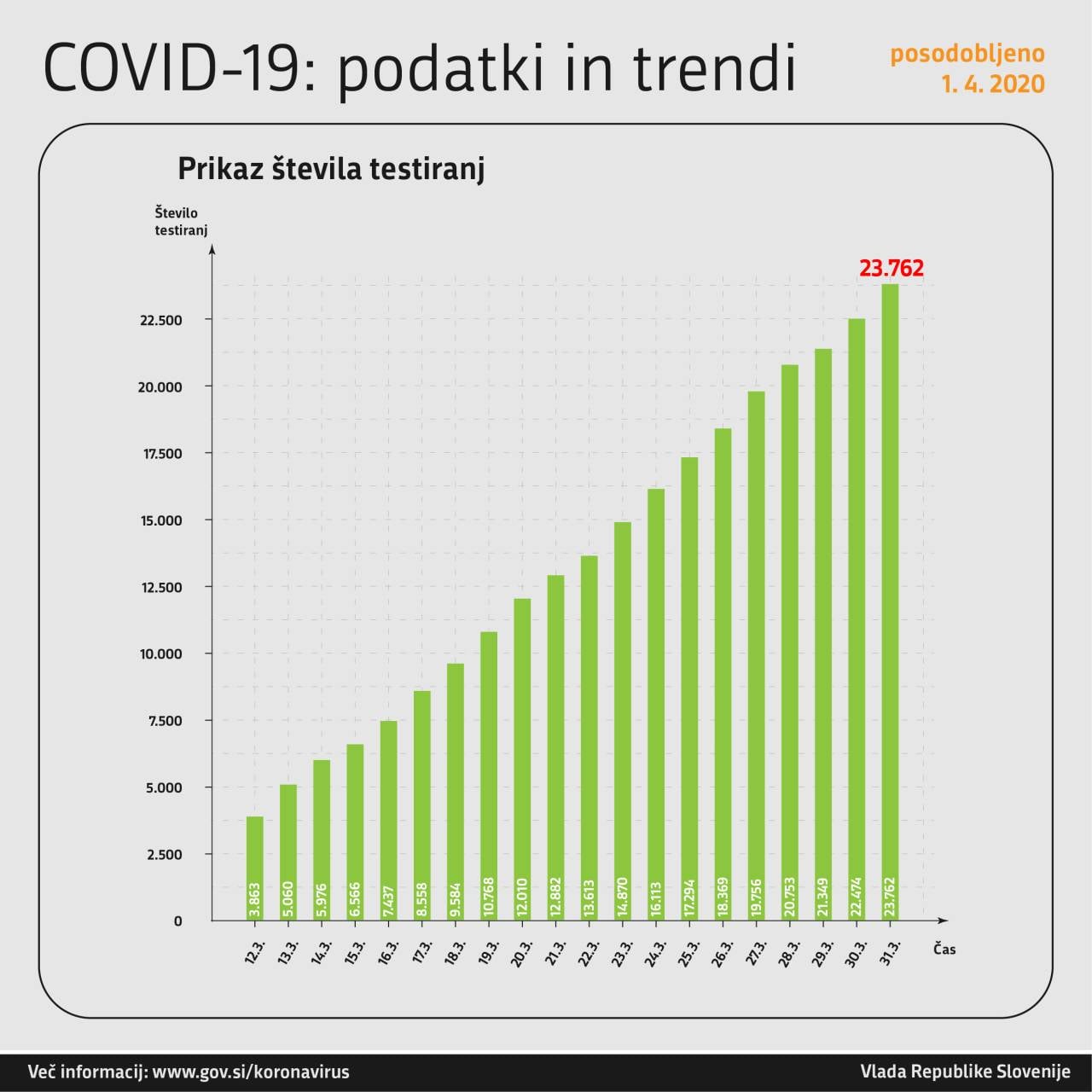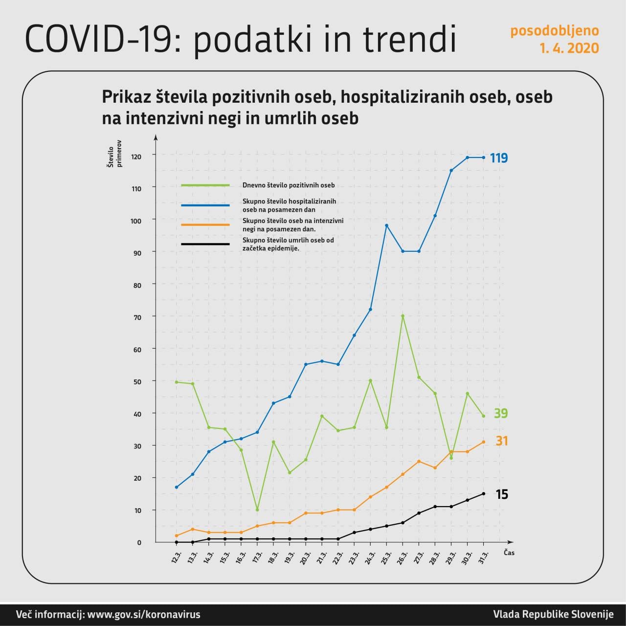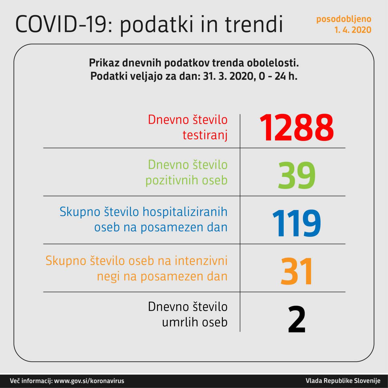 Število hospitaliziranih oseb je 119, od tega jih je na intenzivni negi 31. Včeraj sta zaradi koronavirusa umrli dve osebi.