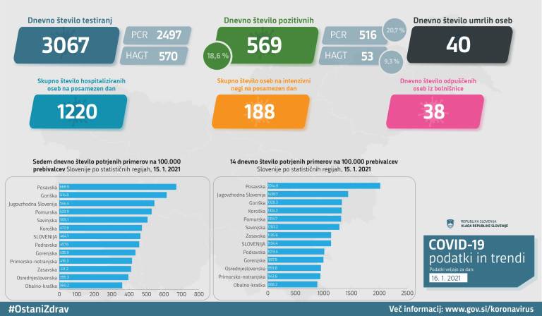 V Sloveniji so včeraj, 16. januarja, opravili 3067 testiranj na koronavirus in potrdili 569 novih okužb, gre za 18,6-odstotni delež.