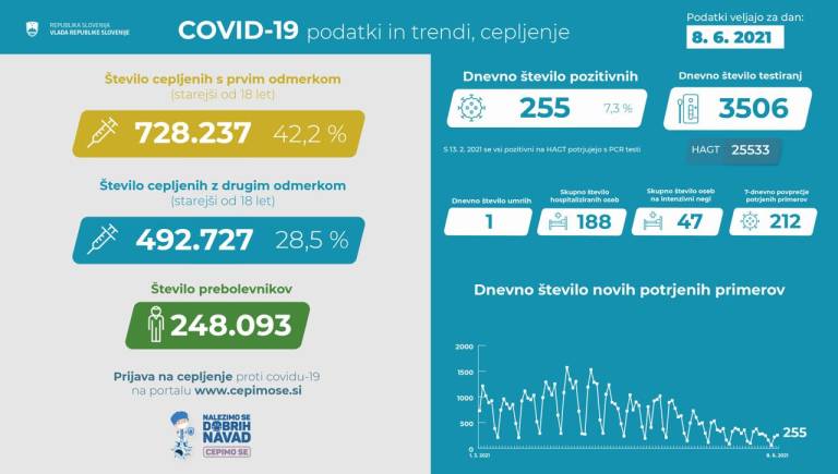 V Sloveniji so včeraj, 8. junija, opravili 3506 PCR testiranj na koronavirus in potrdili 255 novih okužb, gre za 7,3-odstotni delež okužb. Aktivnih okužb v Sloveniji je trenutno 3422.