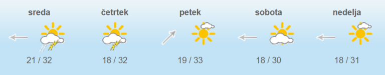 Jutri bo povečini sončno. Popoldne bodo nastale posamezne nevihte. Najnižje jutranje temperature bodo od 14 do 20, ob morju 22, najvišje dnevne od 27 do 33 stopinj Celzija.