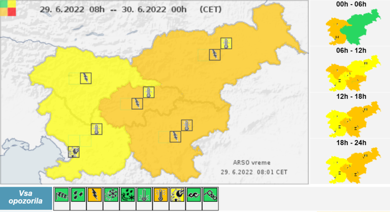 Agencija Republike Slovenije za okolje je za vzhodno polovico Slovenije izdala oranžno opozorilo za veliko možnost neviht in veliko toplotno obremenitev.