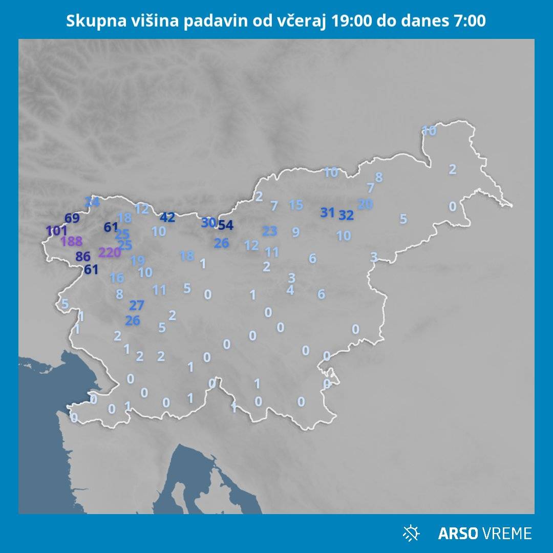 Kot pojasnjujejo vremenoslovci Agencije za okolje, so se včeraj zvečer ob močnem jugozahodnem vetru padavine okrepile nad severozahodno Slovenijo in se tam še zmeraj obnavljajo. Največ dežja je padlo na Voglu in v Bovcu, kjer je v 12 urah padlo 220 milimetrov oziroma 188 milimetrov padavin.