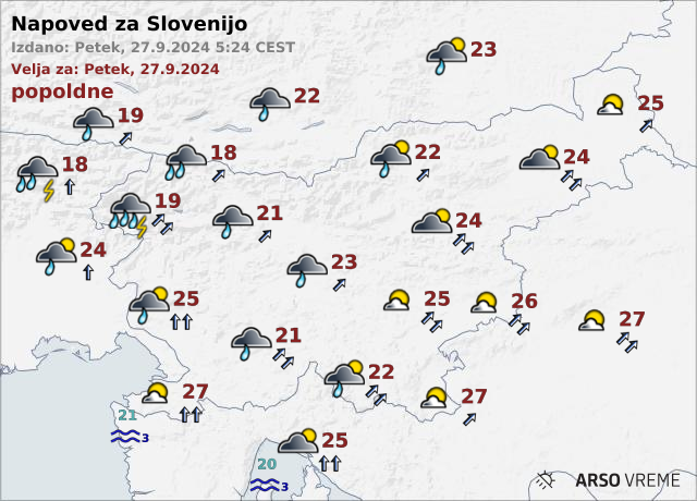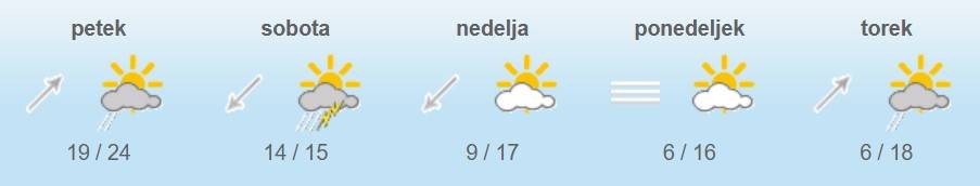 Popoldne se bo oblačnost ponekod trgala. Še bo pihal zmeren jugozahodnik, ob morju okrepljen jugo. Najvišje dnevne temperature bodo od 21 do 27, na severozahodu okoli 18 stopinj Celzija.
