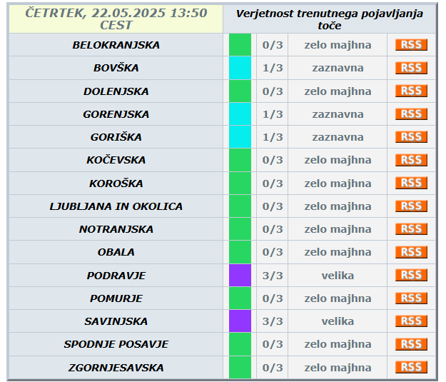 V naslednjih 24 urah lahko po Sloveniji večinoma pričakujemo med 20 in 40, v hribovitem svetu zahodne in južne Slovenije pa tudi okoli 80 mm dežja.