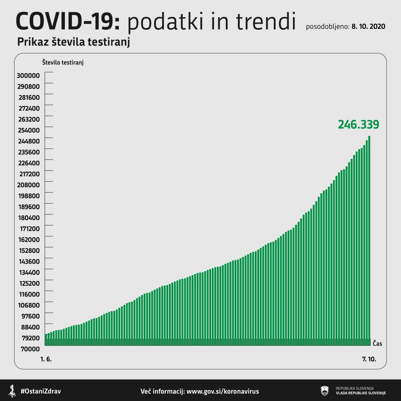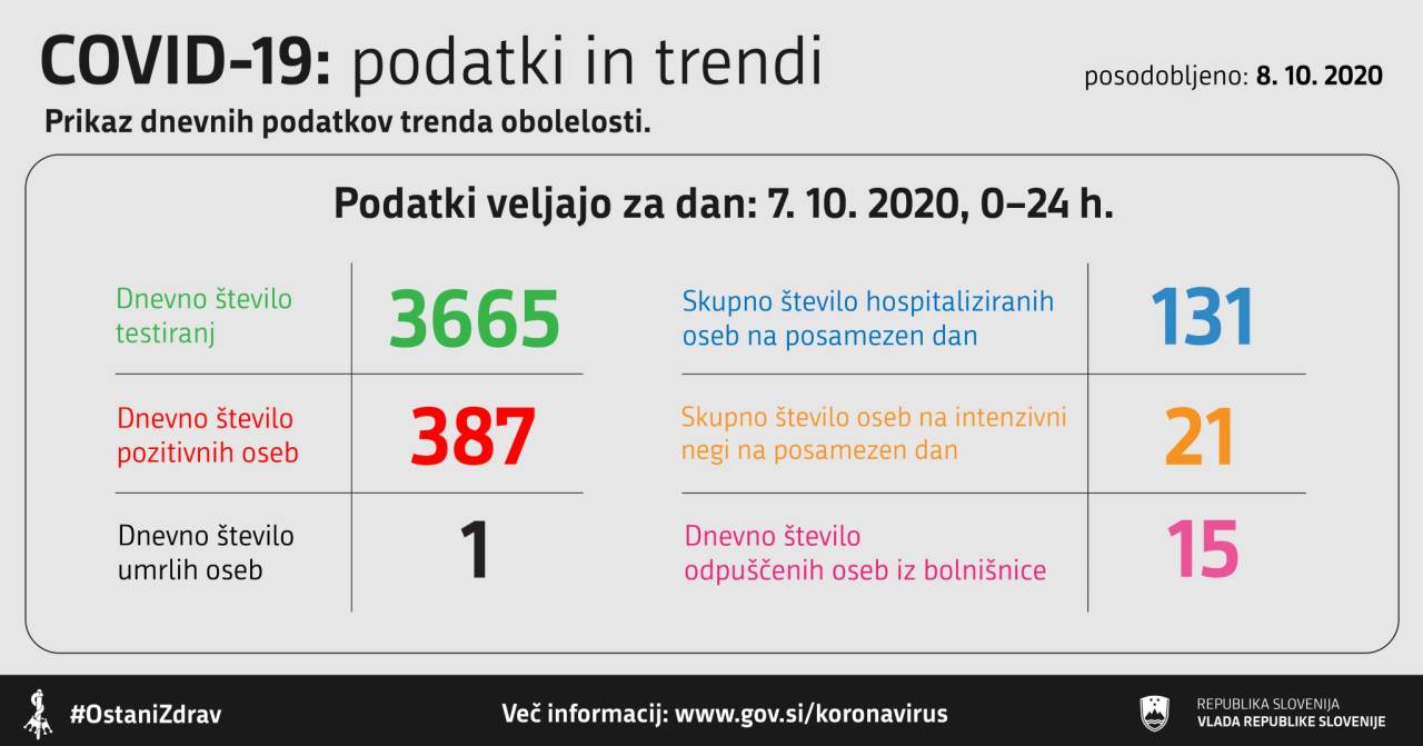 V Sloveniji so včeraj, 7. oktobra 2020, opravili 3665 testiranj na koronavirus, kar je manj kot dan prej, ko so jih opravili 3998. Včeraj so potrdili kar 387 novih okužb, kar pomeni, da je bilo pozitivnih več kot 10 odstotkov od vseh testiranih.