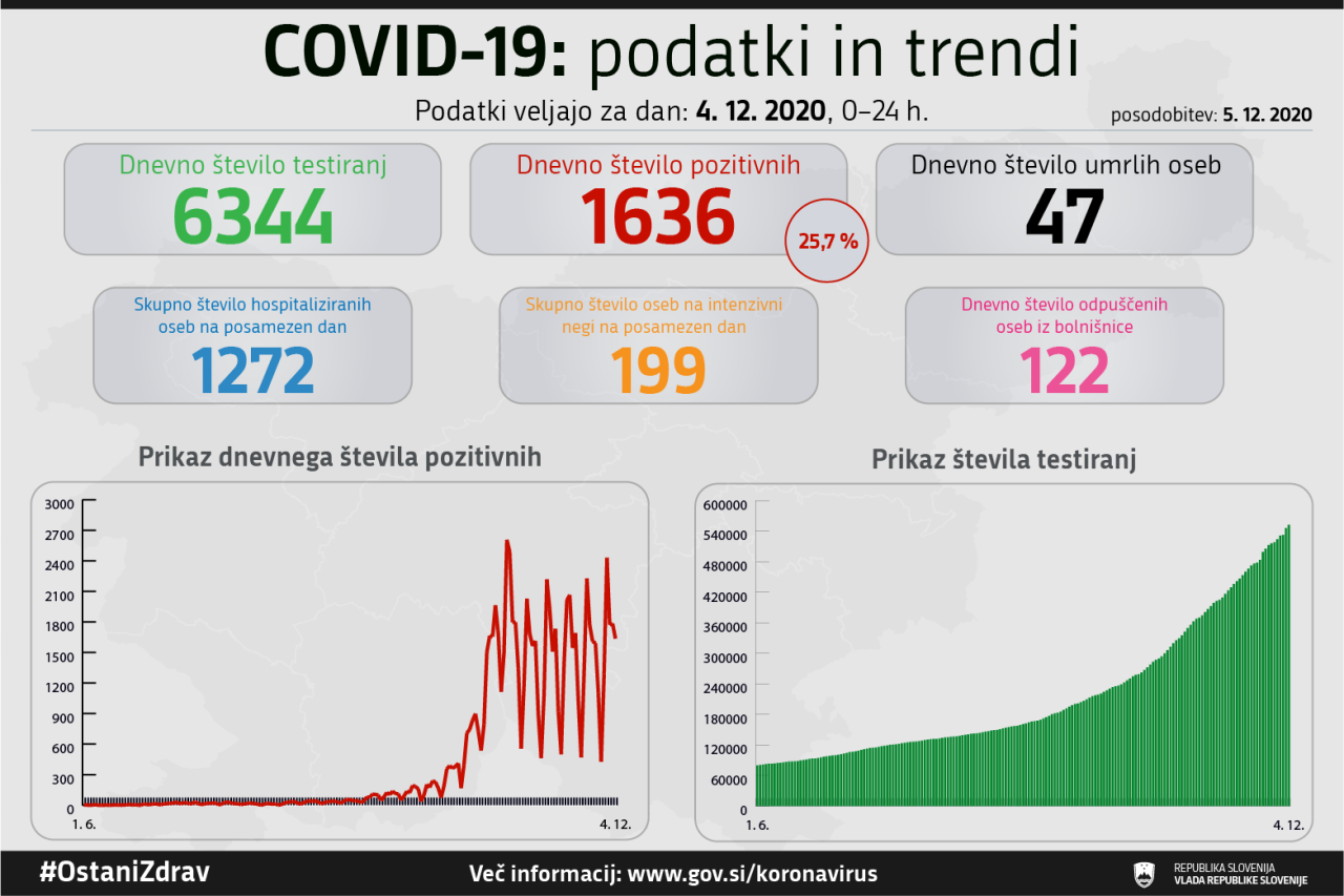 V Sloveniji so v včeraj, 4. decembra, opravili 6344 testiranj na koronavirus in potrdili 1636 novih okužb. To pomeni, da je bil delež pozitivnih testov tokrat 25,7 odstotka