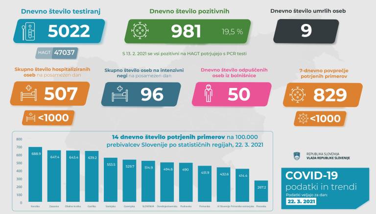 V Sloveniji so včeraj, 22. marca, opravili 5022 PCR testiranj na koronavirus in potrdili 981 novih okužb, gre za 19,5-odstotni delež okužb.