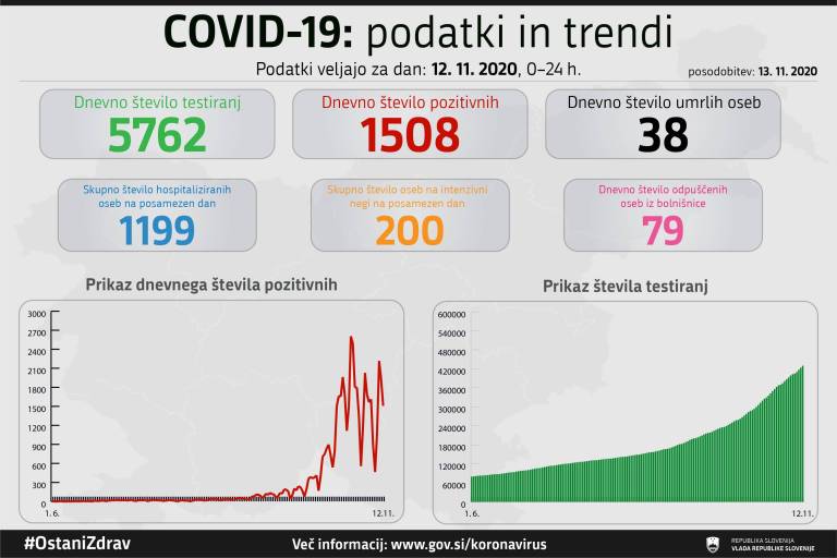 V Sloveniji so v včeraj, 12. novembra, opravili 5762 testiranj na koronavirus in potrdili 1508 novih okužb, delež pozitivnih je bil 26,17 odstotka vseh testiranih.