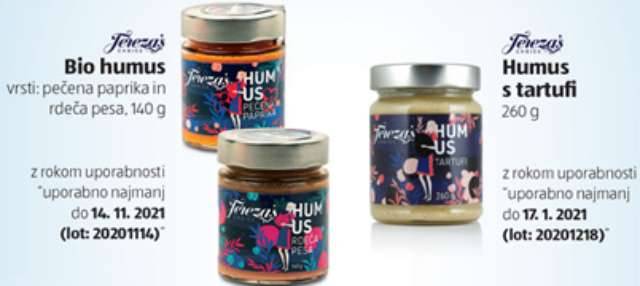 Izdelka bio humus vrste pečena paprika in rdeča pesa sta v 140-gramski stekleni embalaži z lot številko 20201114 in rokom uporabe do 14. novembra 2021.