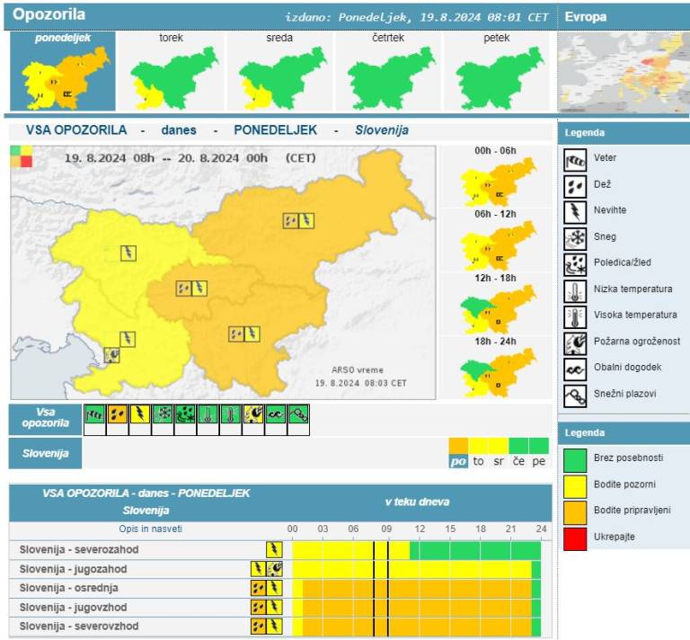 Krajevne padavine, tudi posamezne nevihte, se bodo nadaljevale zvečer in v prvem delu noči. Do jutra bodo povečini ponehale. Najnižje jutranje temperature bodo od 16 do 20 stopinj Celzija.