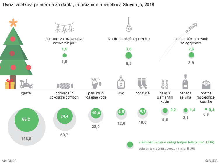 V zadnji tretjini lanskega leta je Slovenija uvozila za 55 milijonov evrov igrač, za 24,5 milijona evrov čokolade in čokoladnih bombonov, za 10 milijonov evrov parfumov, za 4 milijone evrov nogavic ter za nekaj manj kot pol milijona evrov čestitk in poštnih razglednic.