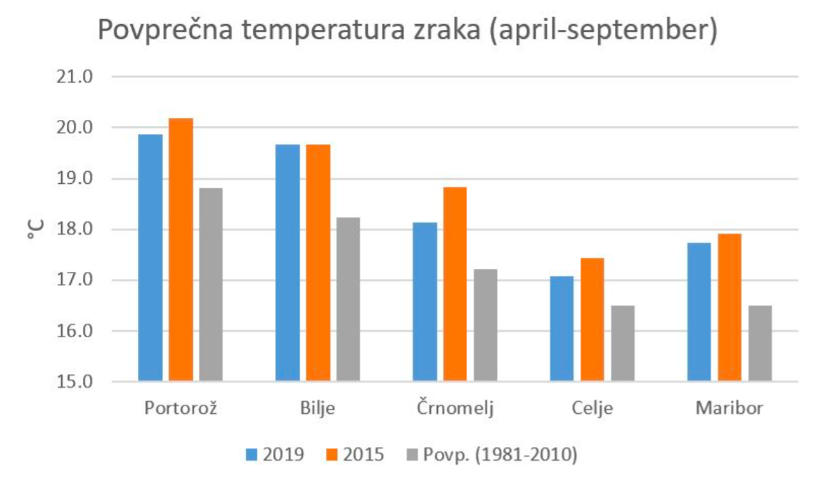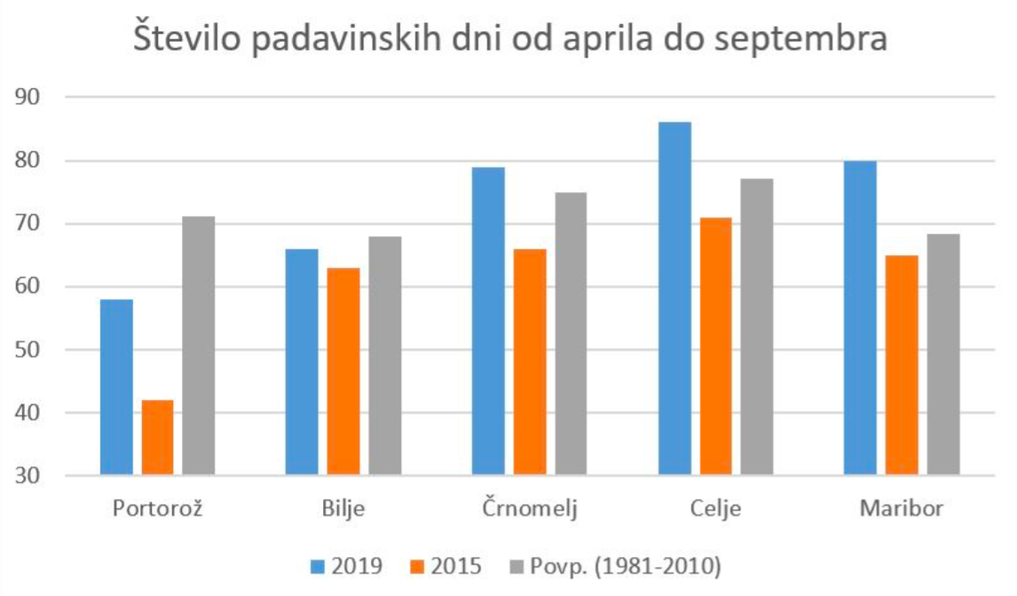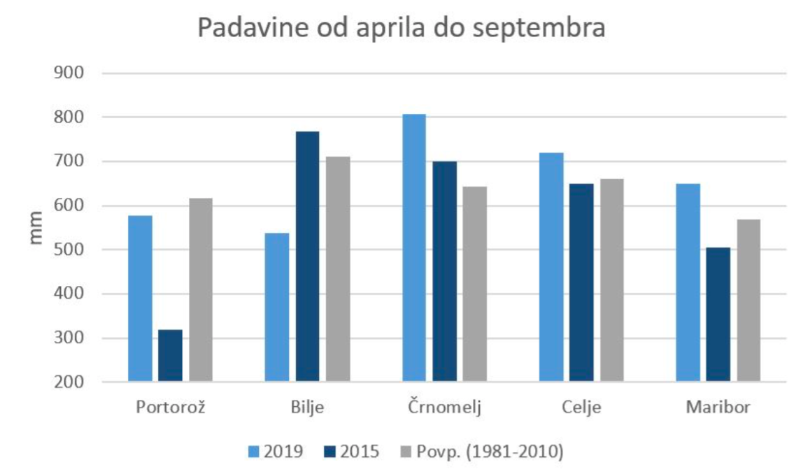 Primerjava z letnikom 2015, ki se prav tako postavlja z lastnostmi vrhunskega letnika, kaže na višje temperature od letošnjih. Padavin je bilo na obalnem območju manj od povprečja in tudi manj od leta 2015, v Podravju in Posavju pa je bilo letos padavin več od povprečja, a je treba upoštevati, da je njihov levji delež k skupni vsoti doprinesel deževen maj. Tudi število letošnjih padavinskih dni je bilo večje kot leta 2015 in tudi večje od povprečja, kar je prav gotovo zahtevalo veliko pozornosti in skrbi za ohranjanje zdravih trt, še posebno na območjih kjer je klestila tudi toča, so pojasnili na Agenciji Republike Slovenije za okolje.