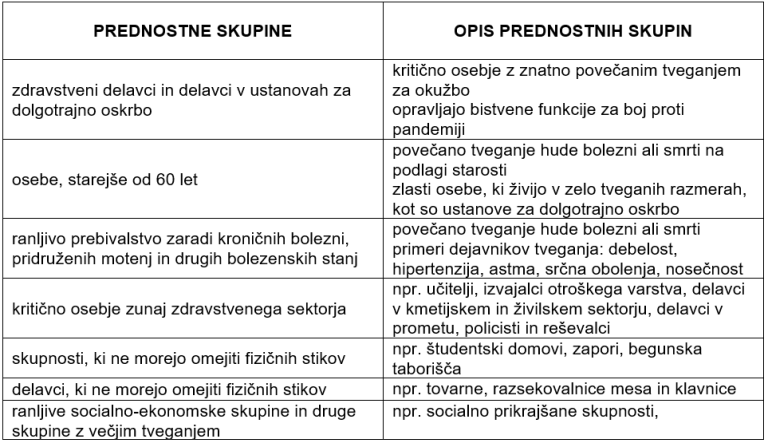 V tabeli so prikazane prednostne skupine in njihovo ocenjeno število. Gre za okviren seznam, ki bi naj bil dovolj prožen, da bo omogočil prilagoditve in posodobitve, ko bodo na voljo podrobnosti o cepivu, ter bodo obravnavane epidemiološke razmere.