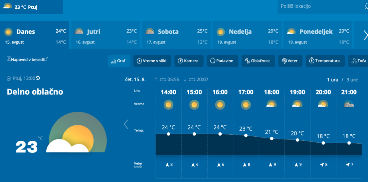 Podobno vreme lahko pričakujemo tudi jutri. Prebudili se bomo v jutro s temperaturami od 10 do 15, ob morju 17 stopinj Celzija. V dopoldanskih urah se bo delno zjasnilo, popoldne pa bo prihajalo do posameznih ploh, lahko se pojavi tudi kakšna nevihta. Najvišje dnevne temperature bodo od 22 do 25, na Primorskem do 29 stopinj Celzija.
