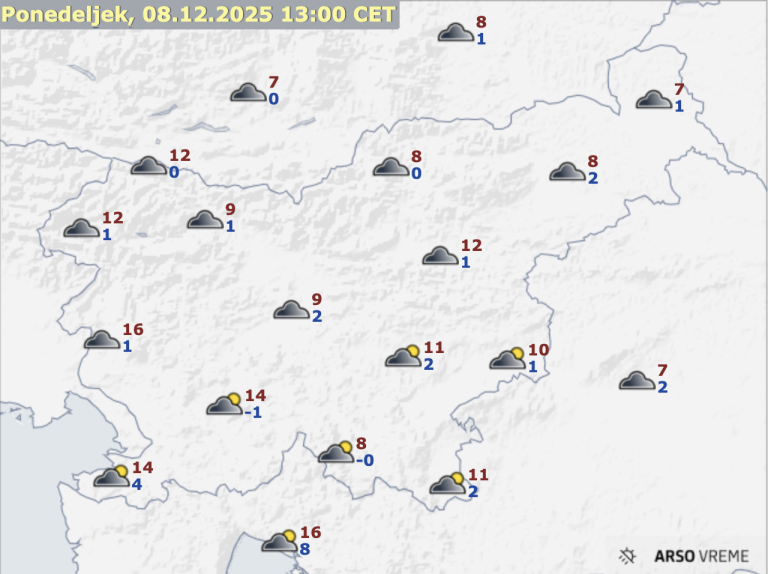 V ponedeljek bo sprva oblačno, v sosednjih pokrajinah Avstrije bodo nastajale rahle padavine, čez dan pa se bo od zahoda nekoliko jasnilo. Megla ali nizka oblačnost bo najvztrajnejša v sosednjih delih Madžarske in v notranjosti Hrvaške.