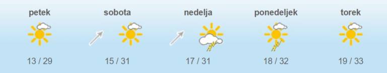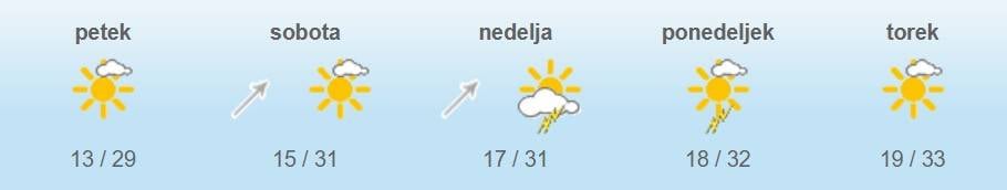 Jutri bo sončno, zapihal bo jugozahodni veter. Najnižje jutranje bodo od 11 do 17, najvišje dnevne od 26 do 32 stopinj Celzija. V nedeljo bo večinoma sončno in vroče. Popoldne ni izključena kakšna nevihta.