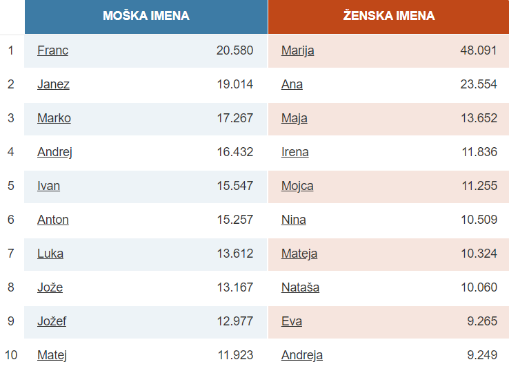 Ste vedeli? Prebivalci Slovenije imamo več kot 60 tisoč različnih imen. Na prvem mestu med najpogostejšimi imeni še vedno ostajata Franc in Marija, a jih je vse manj.