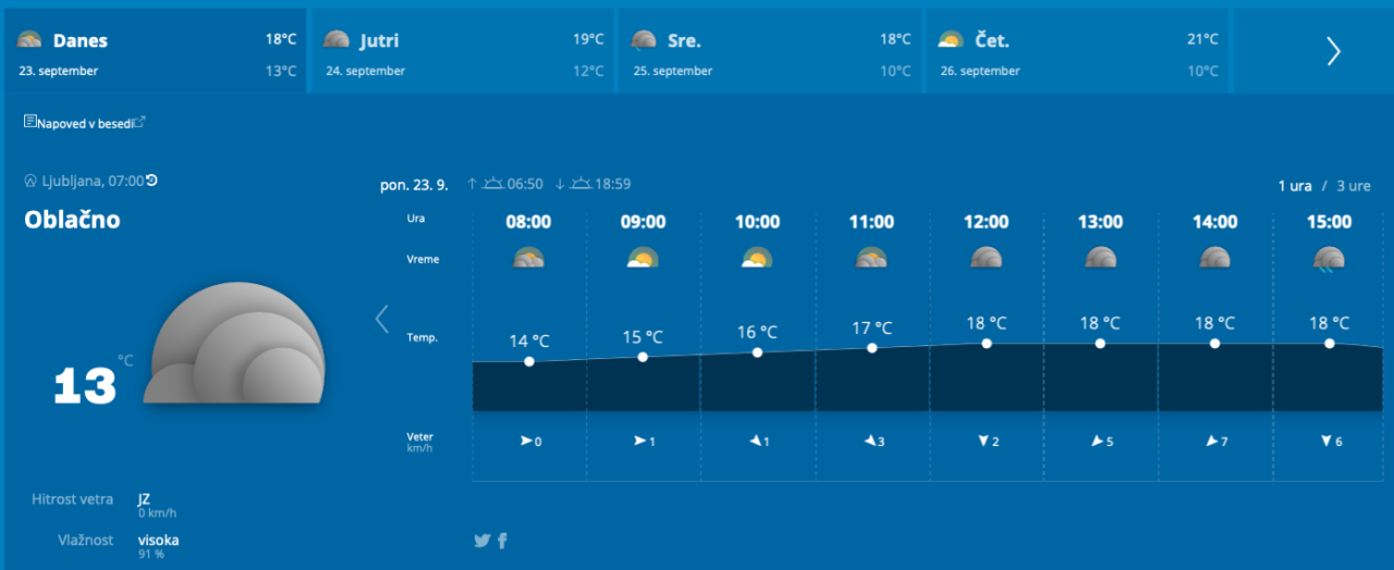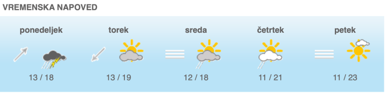Jutri dopoldne se bo oblačnost trgala, na zahodu se bo delno razjasnilo. Popoldne bo zmerno do pretežno oblačno, več sonca bo na Primorskem. Najvišje dnevne temperature bodo od 17 do 20, na Primorskem do 23 stopinj Celzija.