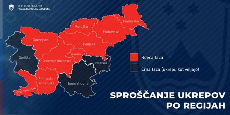 Pomurska, Podravska, Savinjska, Koroška, Zasavska, Osrednjeslovenska, Primorsko-notranjska, Gorenjska in Obalno-kraška so regije, kjer je sproščanje določenih ukrepov možno.