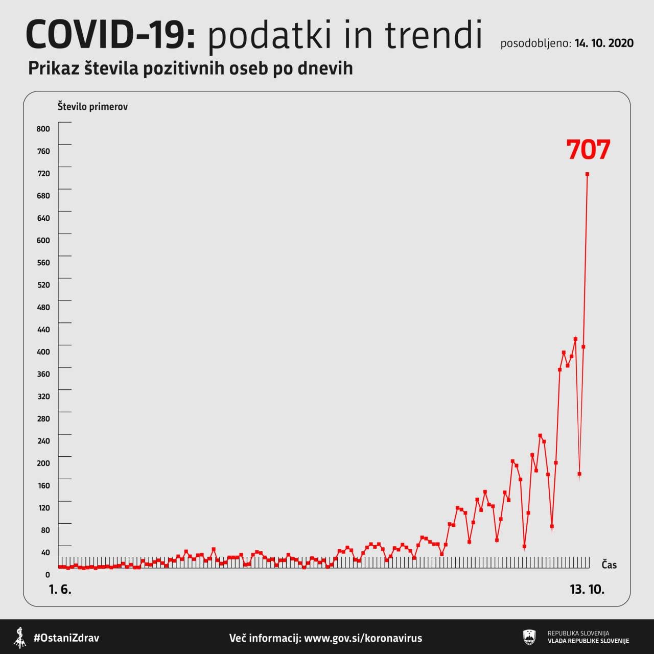 V Sloveniji so v torek, 13. oktobra, opravili 4902 testiranj na koronavirus. Potrdili so 707 novih okužb. Skupno število vseh doslej potrjenih okužb s koronavirusom v Sloveniji zdaj znaša 9938. Delež pozitivnih testov je tako 14,4-odstoten.
