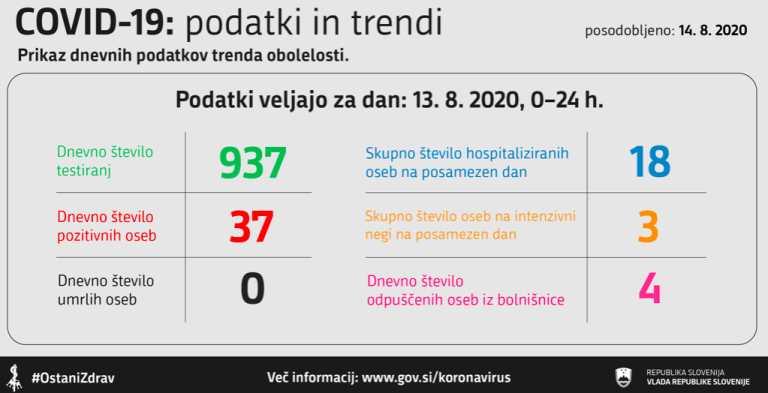 Včeraj, 13. avgusta 2020, so v Sloveniji opravili 937 testiranj na okužbo s koronavirusom. Pri tem so potrdili 37 novih okužb. Za primerjavo, dan pred tem je bilo ob 856 testiranjih 29 pozitivnih primerov.