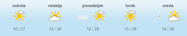 Najnižje jutranje temperature bodo od 9 do 13, ob morju okoli 16, najvišje dnevne od 23 do 26, na Primorskem do 30 stopinj Celzija.