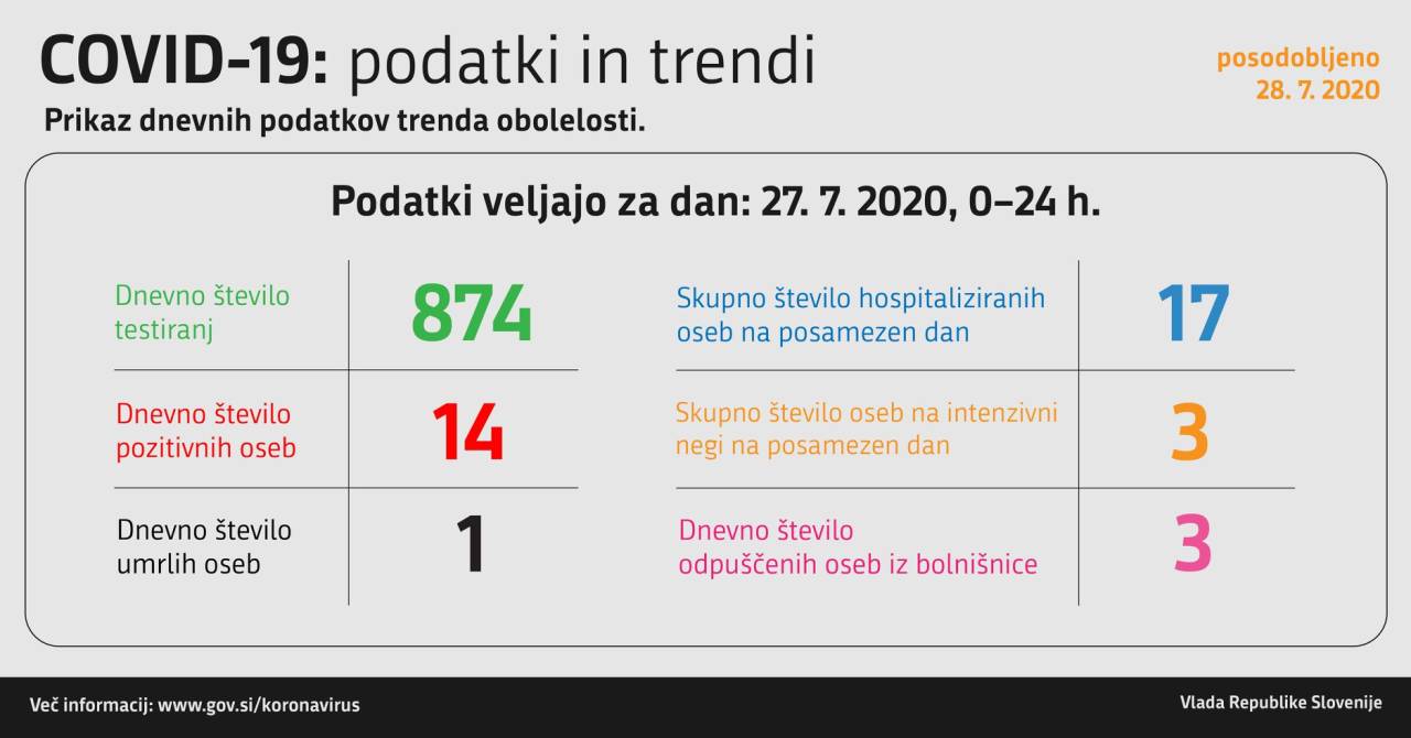Včeraj, 27. julija, so v Sloveniji opravili 874 testiranj za novi koronavirus. Odkritih je bilo 14 novih okužb s koronavirusom.