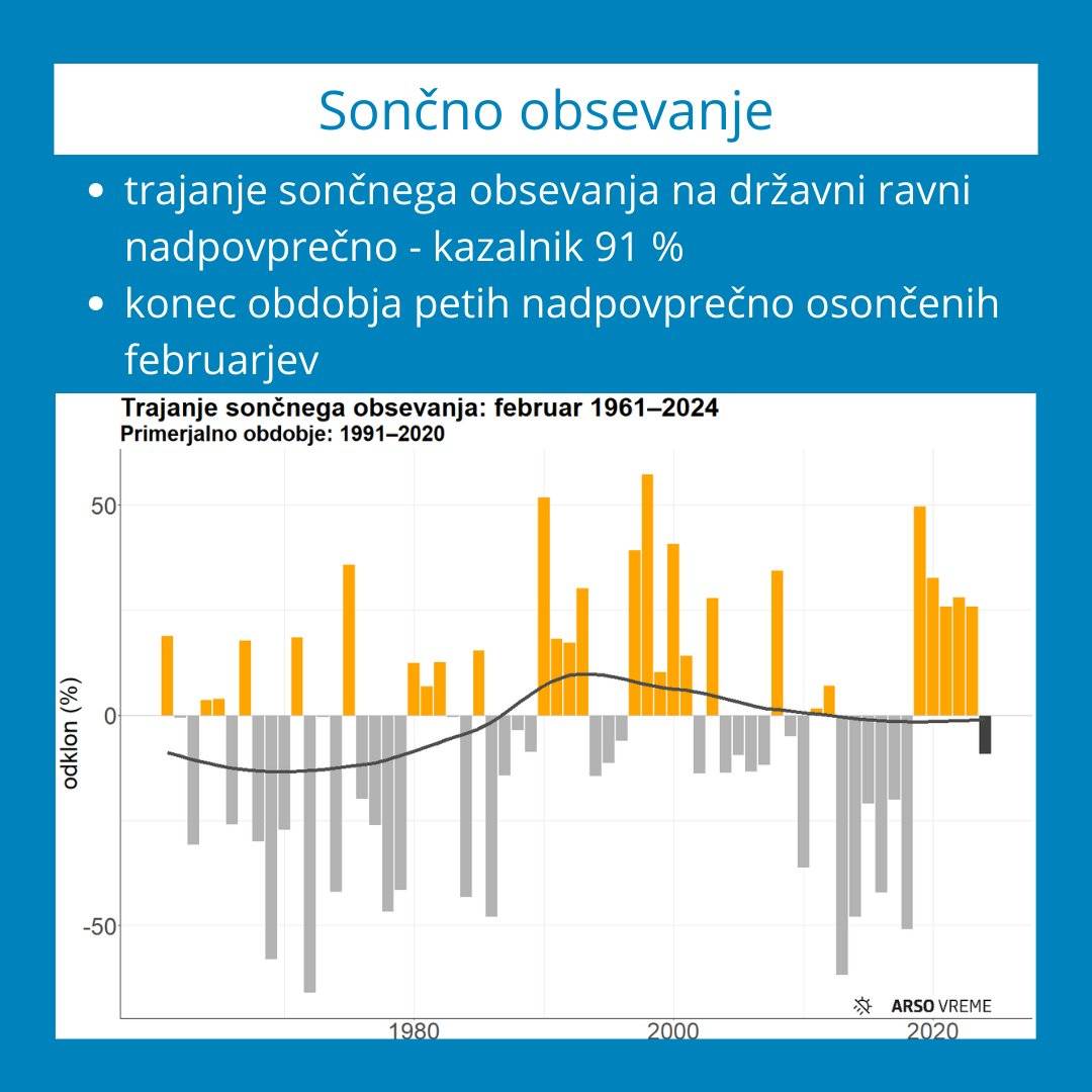 Letošnji februar je bil na ravni Slovenije nekoliko podpovprečno osončen. Najbolj osončen je bil februar 1998, sledita mu februarja 1990 in 2019. Najmanj je bil osončen februar 1972.