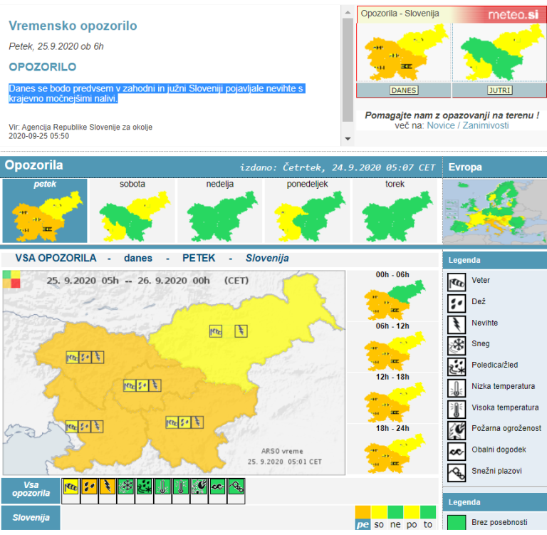 Agencija Republike Slovenije za okolje opozarja, da se bodo danes predvsem v zahodni in južni Sloveniji pojavljale nevihte s krajevno močnejšimi nalivi. V kratkem času bo padla velika količina padavin, zato so razglasili oranžni alarm.