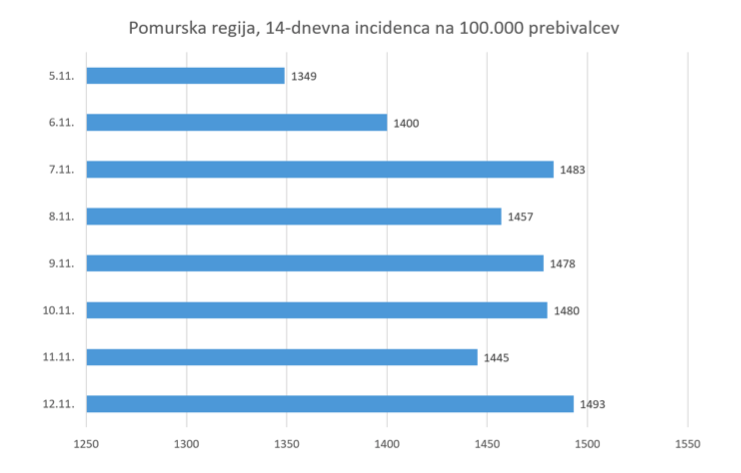 Kacin je še poudaril, da ima »med regijami najvišjo incidenco, tako kot smo v začetku tedna napovedali, trenutno Pomurska regija – 1493. Incidenca se v Gorenjski regiji še naprej hitro znižuje in je že padla pod 1400, zdaj znaša 1397.«