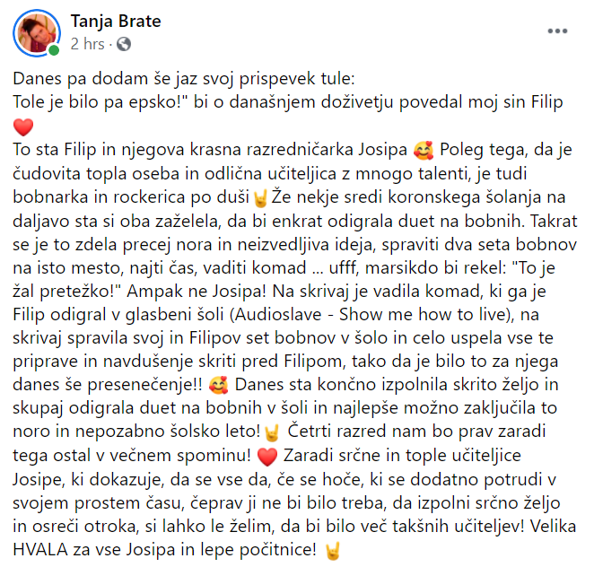 Njuno zgodbo o prijaznosti je zapisala mama Tanja. Zapisala je, da sta si Filip in učiteljica zaželela, da bi enkrat odigrala duet na bobnih.