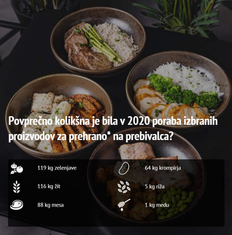 Med drugim tudi, kolikšna je bila povprečna poraba izbranih živil tipičnega Slovenca. V povprečju je tako povprečni prebivalec čez celo leto porabil 119 kilogramov zelenjave, 116 kilogramov žit, 88 kilogramov mesa, 64 kilogramov krompirja, pet kilogramov riža in kilogram medu.