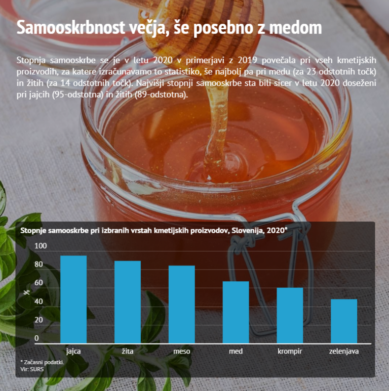Stopnja samooskrbe se je lani glede na predhodno leto povečala pri vseh kmetijskih proizvodih, za katere statistični urad izračunava to statistiko. Najbolj se je povečala pri medu, za 23 odstotnih točk na 67 odstotkov, in žitih, za 14 odstotnih točk na 89 odstotkov.